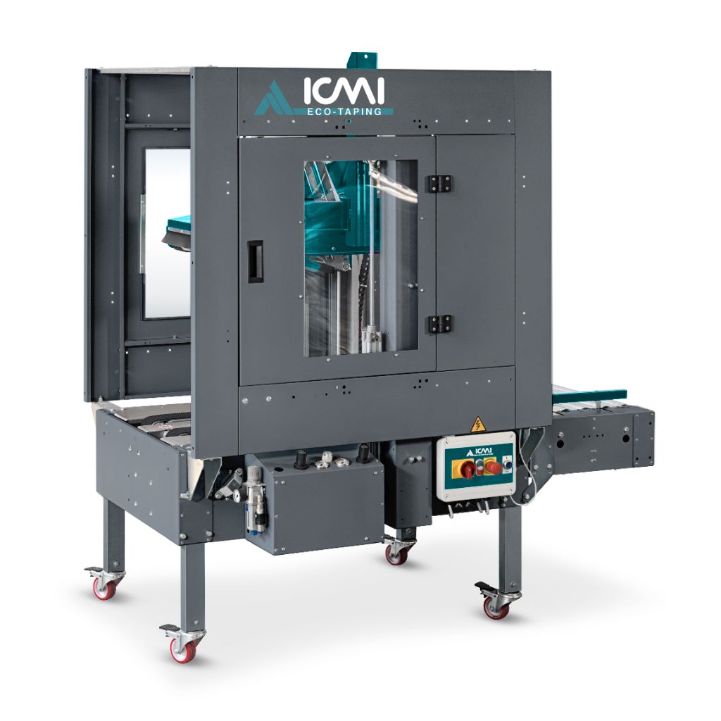 Self- dimensioning automatic case sealers equipped with upper and lower dragging belts that seal with adhesive tape or self-adhesive paper variable-format American boxes. This type of machine is particularly recommended for sealing tall and narrow boxes, as the drive is via four belts, two upper and two lower, horizontal and parallel to the work surface.