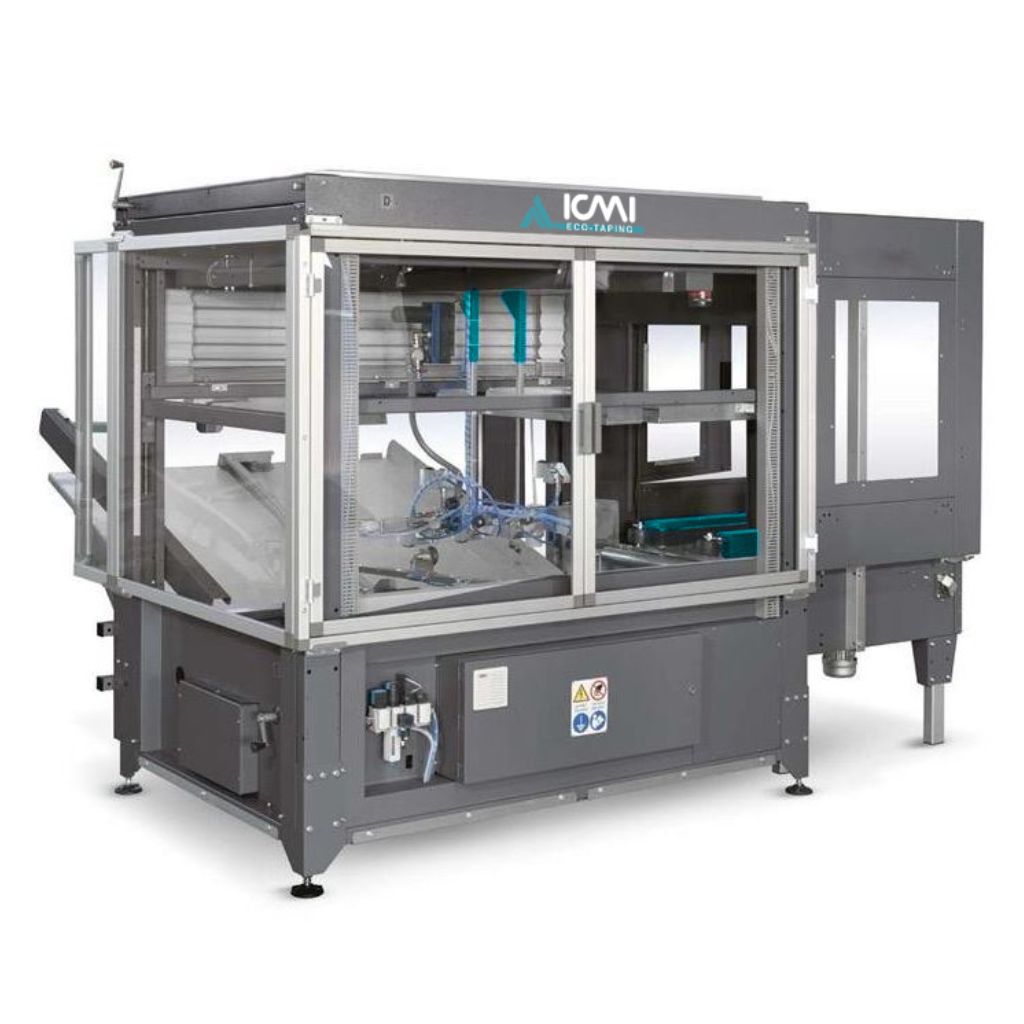 ICM-F855 forma automaticamente le scatole prelevandole dal magazzino laterale ripiegando le quattro falde inferiori. La scatola formata viene nastrata automaticamente con carta gommata o nastro adesivo e avviata alla linea di riempimento. la formatura della scatola, grazie a un sistema brevettato, avviene nel modo più affidabile anche in caso di cartone leggero in quanto qualsiasi interferenza tra le falde è completamente eliminata.